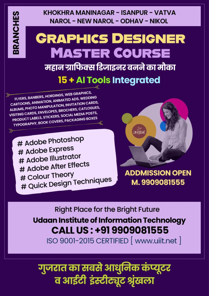 Welcome to Udaan Institute of Information Technology. We are the number one computer training institute in Ahmedabad Gujarat. We provide Advanced Graphics Designing Training Program in our various locations in Ahmedabad. After completing this course, you can build your career in the field of Graphics Designing.